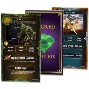 The Sacred Amulets Playing Cards feature completely custom artwork in every aspect of the design, play a one vs one battle, Sacred Duo or Sacred Trio battle.